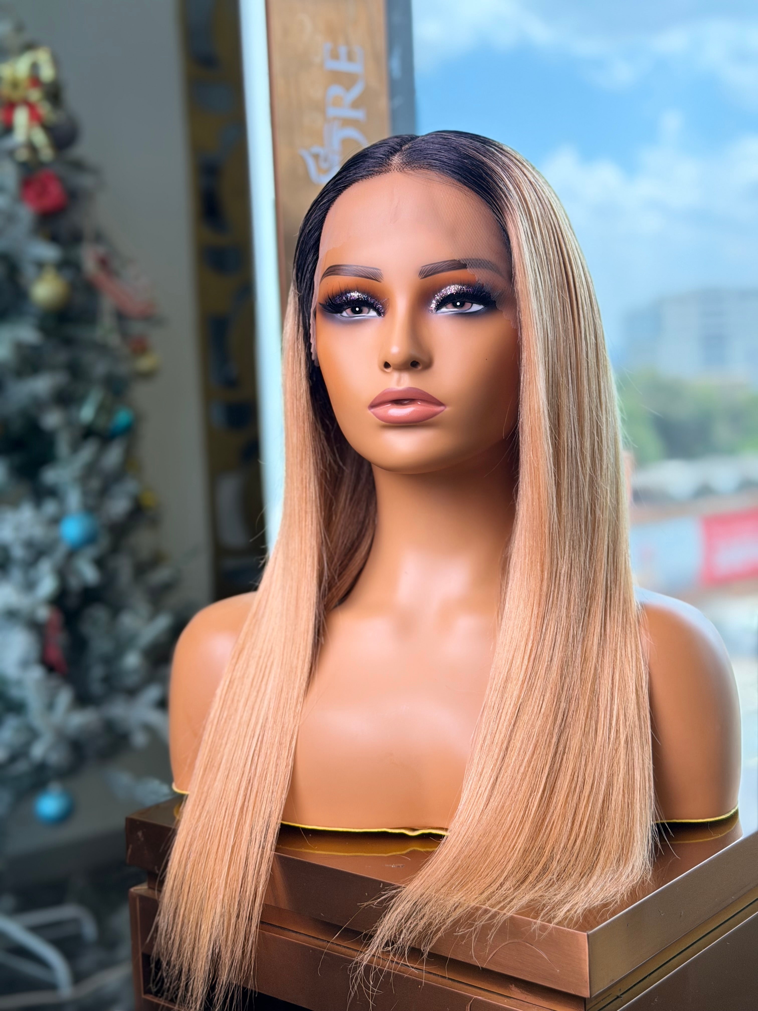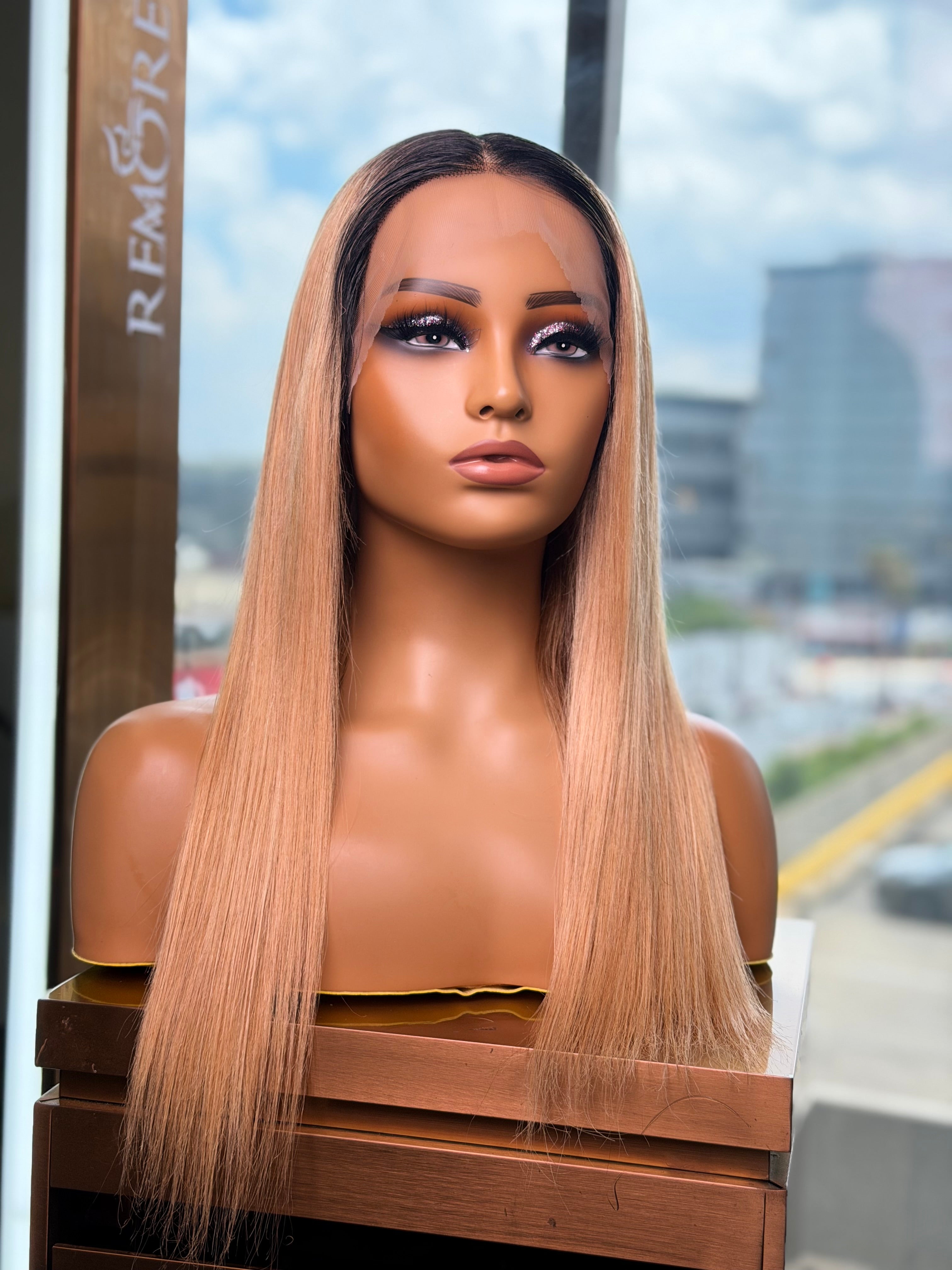 This stylish 22-inch ombre blonde wig features subtle darker roots that fade into golden blonde ends, creating a natural sun-kissed look. The wig provides full coverage with an ear to ear lace front closure for an undetectable natural hairline and seamless sides and back. The heat-friendly synthetic fibers can be styled with heat tools and shaped to your preference.